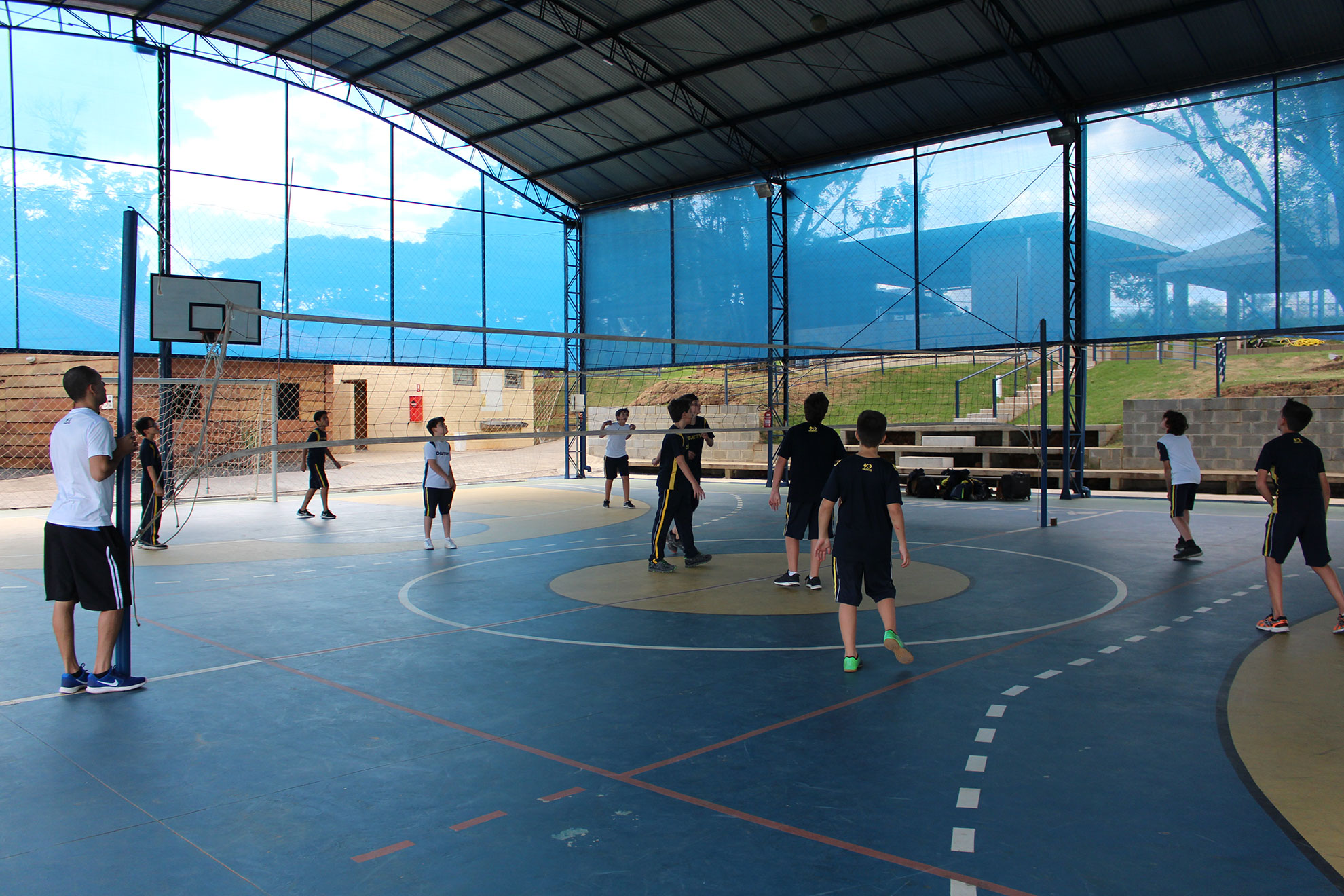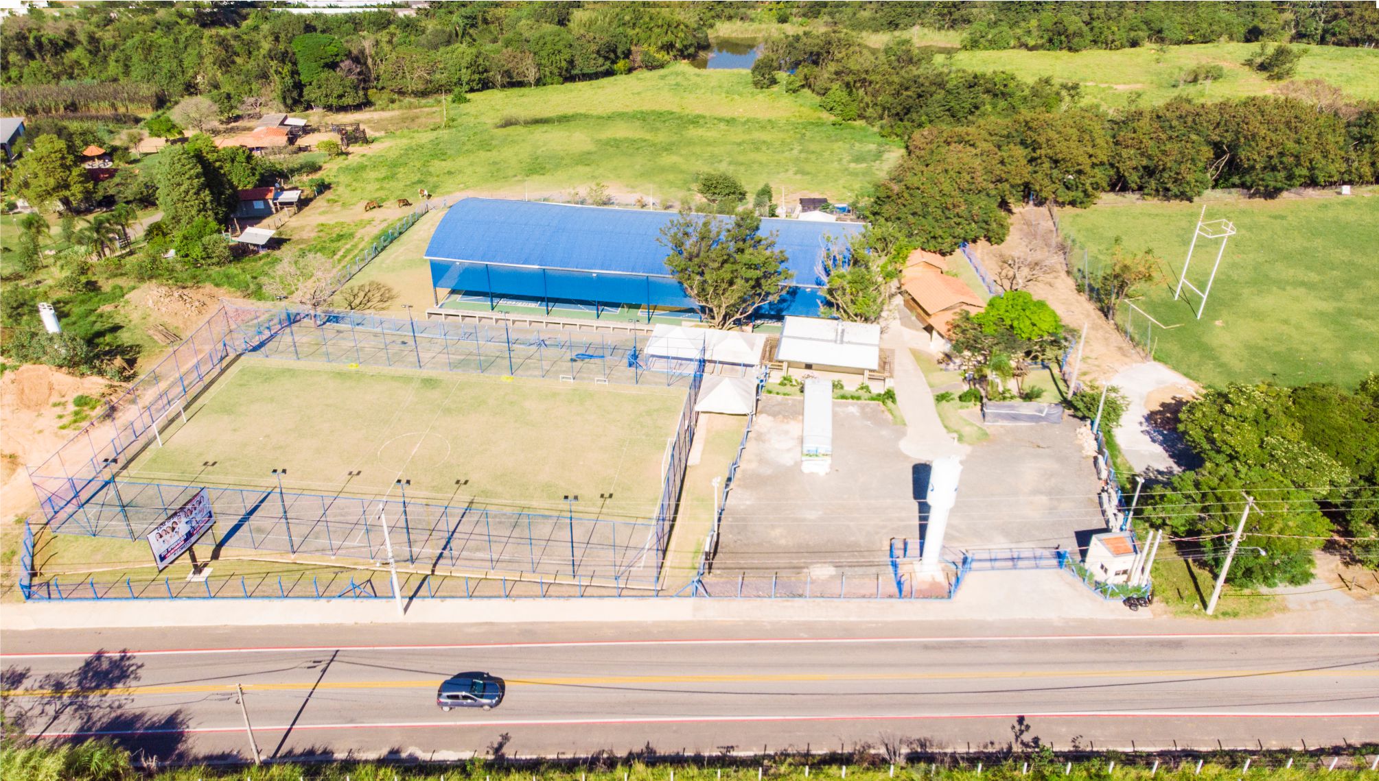 Com 02 quadras poliesportivas cobertas, num total de 1.100 m2, arquibancada com capacidade para aproximadamente 200 pessoas e um campo gramado de futebol society com 1.344 m2, esse ambiente, totalmente cercado e iluminado, está inserido em meio à natureza. Árvores de várias espécies, nativas ou frutíferas, hortas, flores e animais vivem em perfeita harmonia.